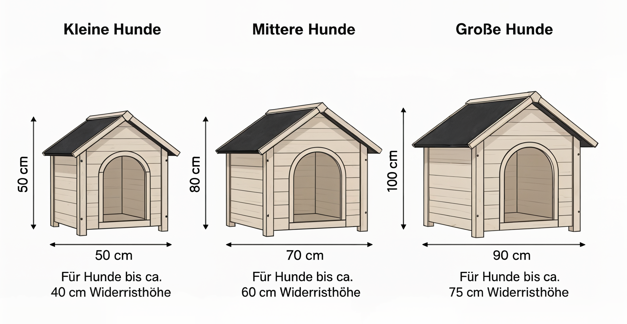 Selbst für kleine Hunde sollte die Hütte hoch genug sein, dass sie bequem stehen können. Für größere Rassen gilt: mindestens 80–100 cm Höhe und eine ausreichend breite Schlaffläche.