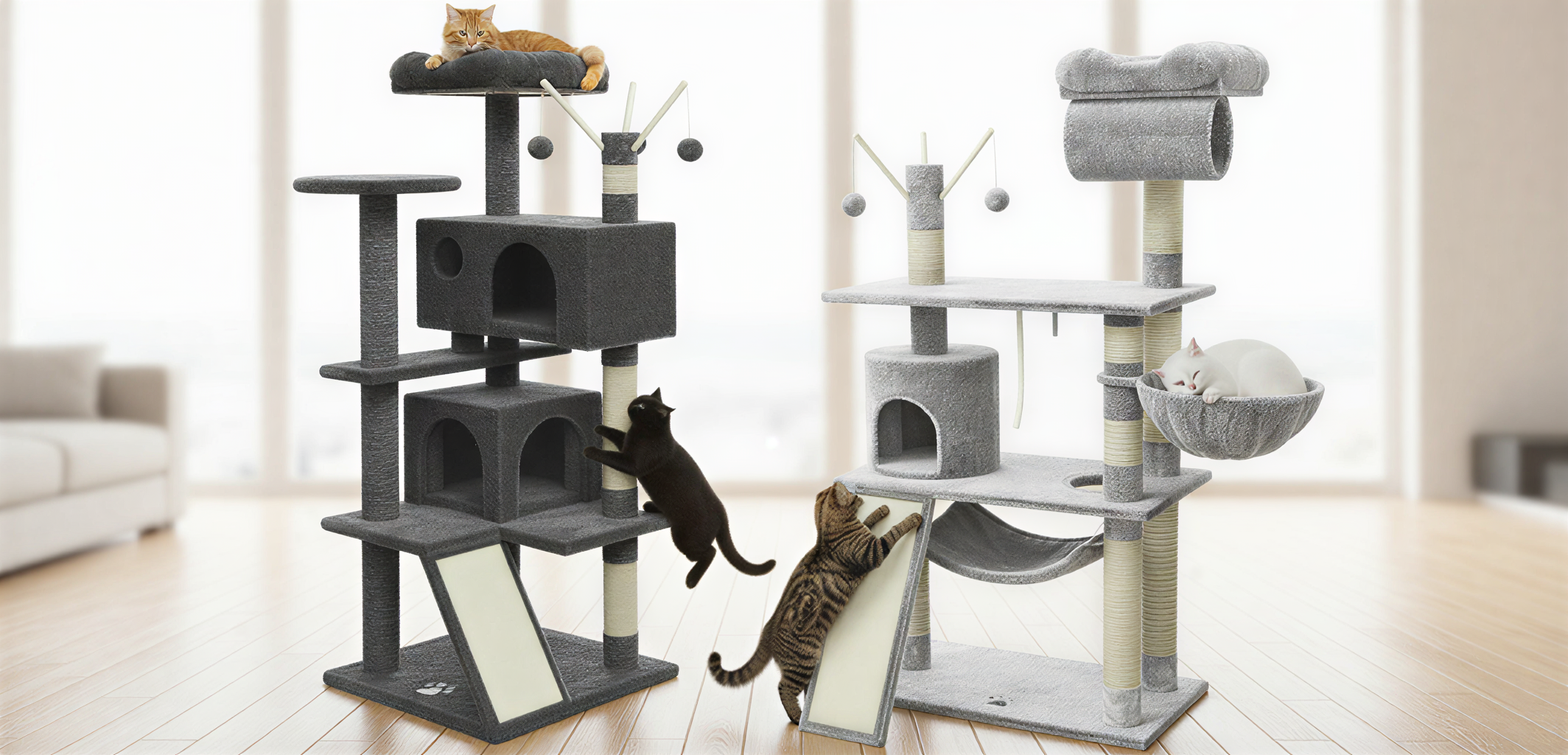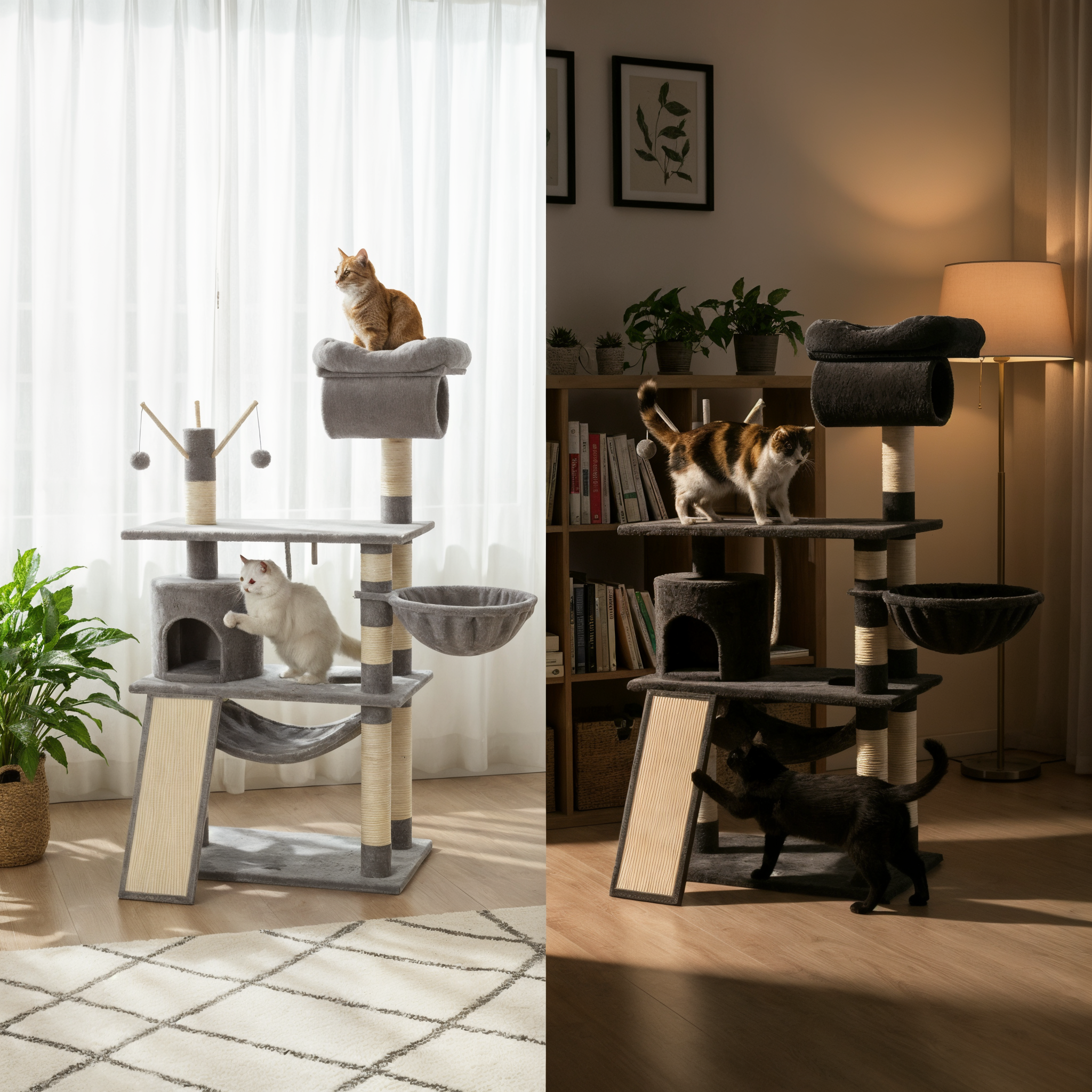 Kratzbäume sind in vielen Größen und Ausführungen erhältlich – von kompakten Modellen für kleine Wohnungen bis hin zu deckenhohen Kratzbäumen mit mehreren Etagen. Die Wahl hängt von deinem Wohnraum, dem Platzangebot und den Bedürfnissen deiner Katze ab.