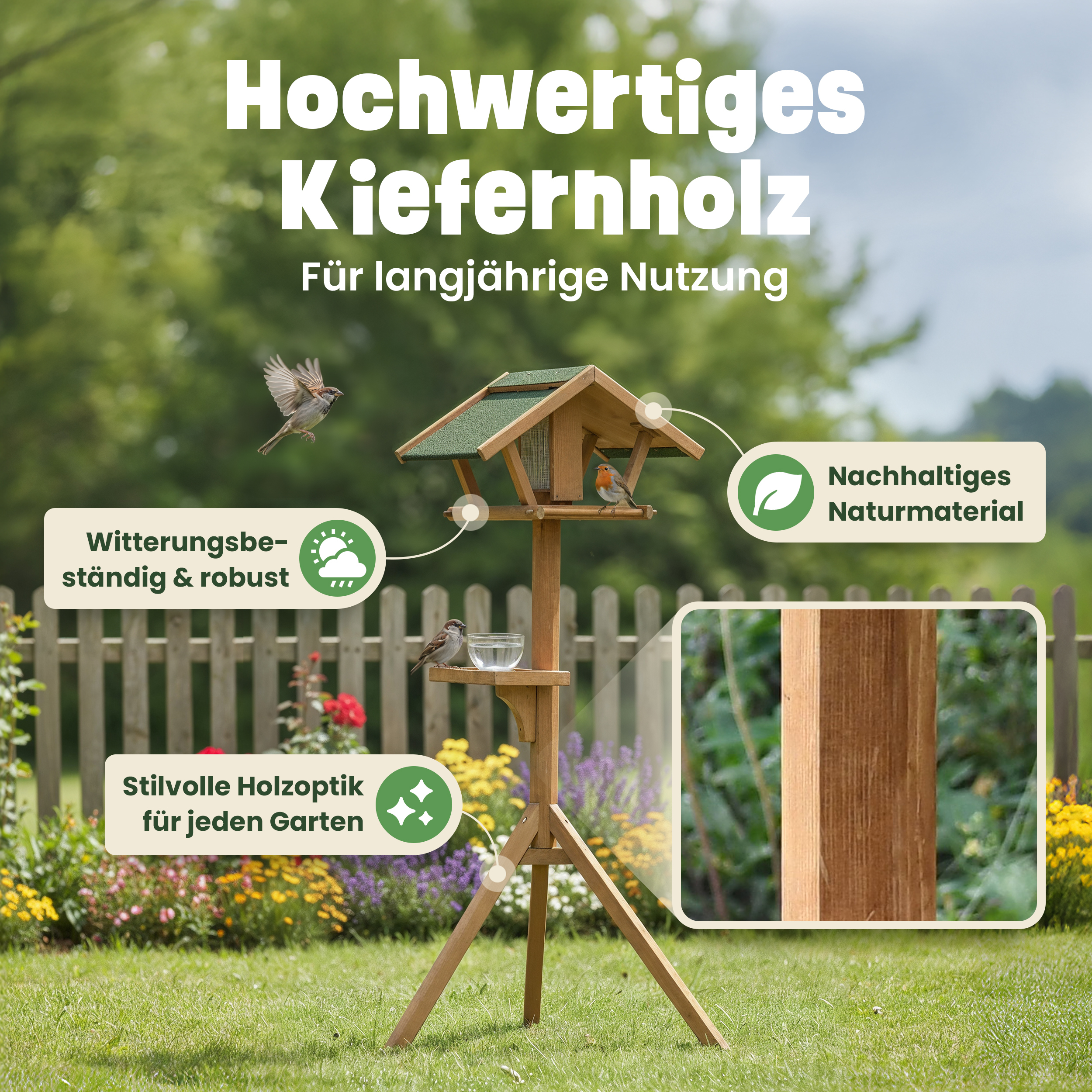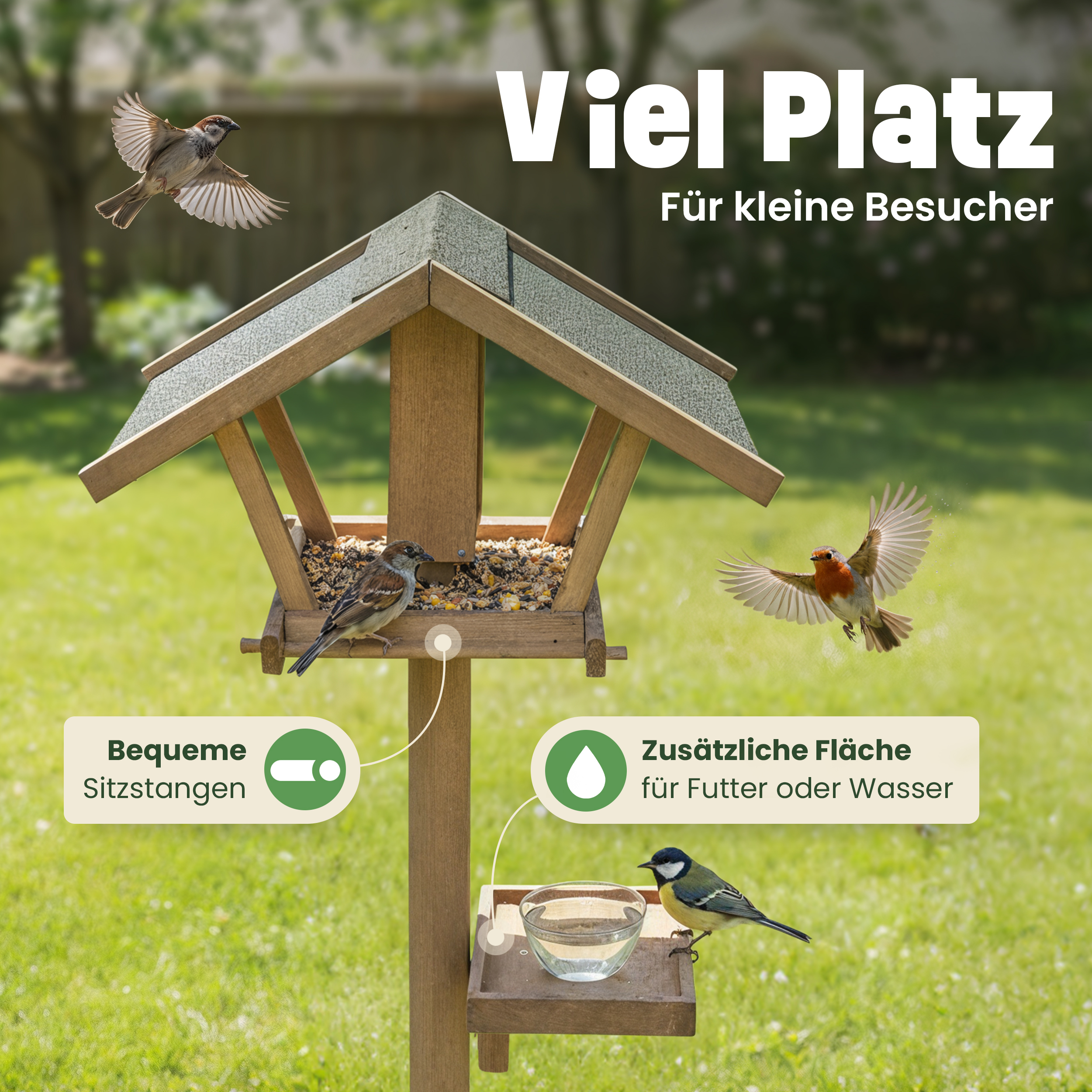 - Großzügige Futterfläche mit mehreren Sitzstangen – ideal für Meisen, Spatzen & Rotkehlchen